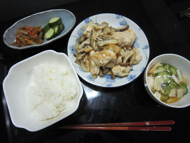 バターと塩コショウ、白ワインで適当に焼いた鶏肉ときのこがメイン。